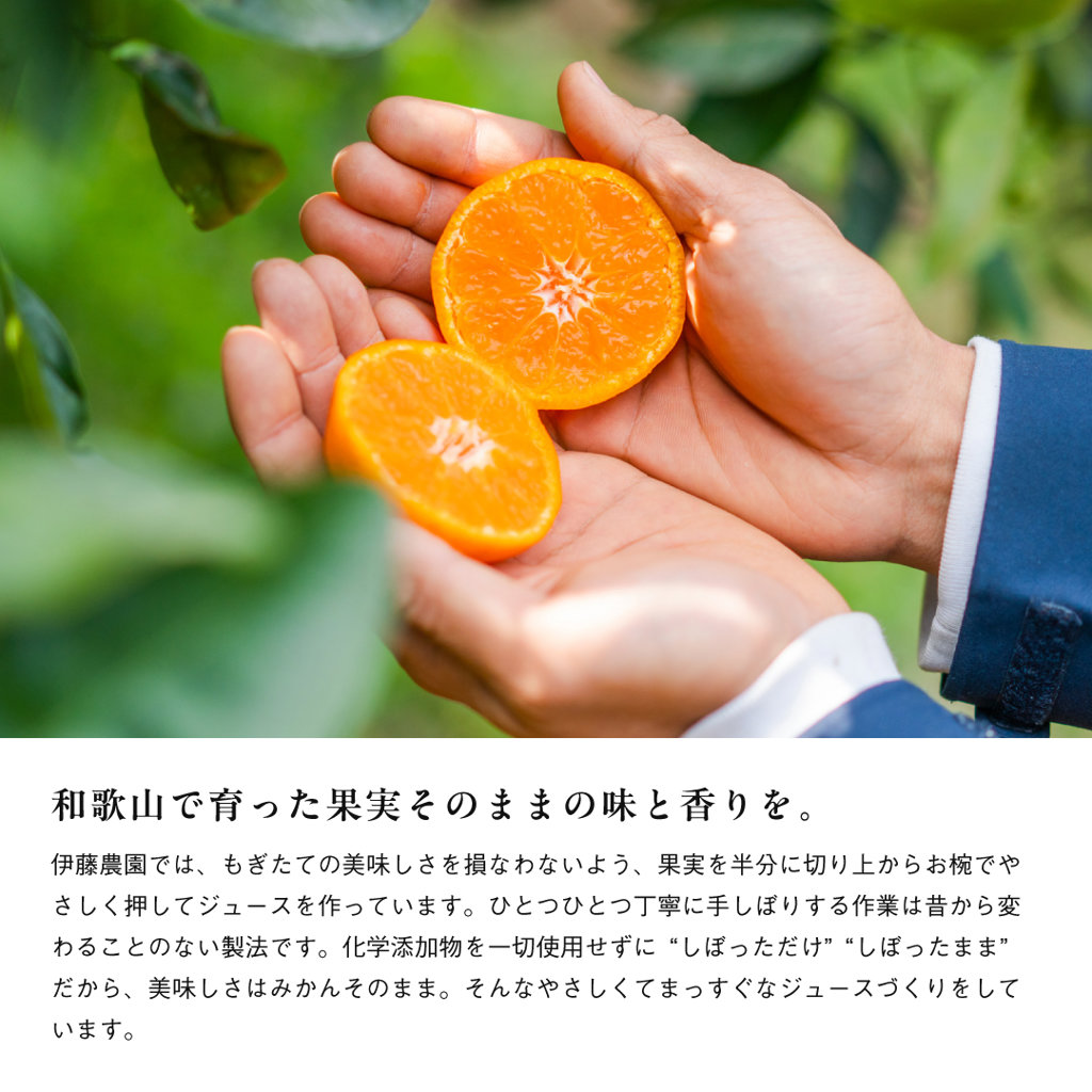 「みかんがもつ、果実本来のおいしさを味わってもらいたい」その思いから、中の果肉の部分だけを搾る独自製法でジュースを作っています。一般的な搾り方であれば搾汁率が50%以上あるのに対して、伊藤農園の製法だと搾汁率は30%ほど。180mlのジュースを1本作るのに、約8個ものみかんを使用するのです。柑橘本来の味や風味を楽しめ、味は濃いのにすっきりした飲み口!本当においしいところだけを、贅沢に使用してできる本物の味です。
