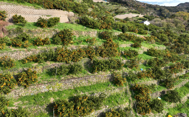 また、有田のみかん園の多くは傾斜地にあり、石垣階段型のみかん畑が今も残されています。江戸時代から先人たちが手作業で築いてきた石垣は、補修を重ねながら、現在も大切に守られています。石垣には、保温・排水・光の反射といった役割があり、水はけの良さが、水っぽさのない、甘みとコクのあるみかんを育てます。